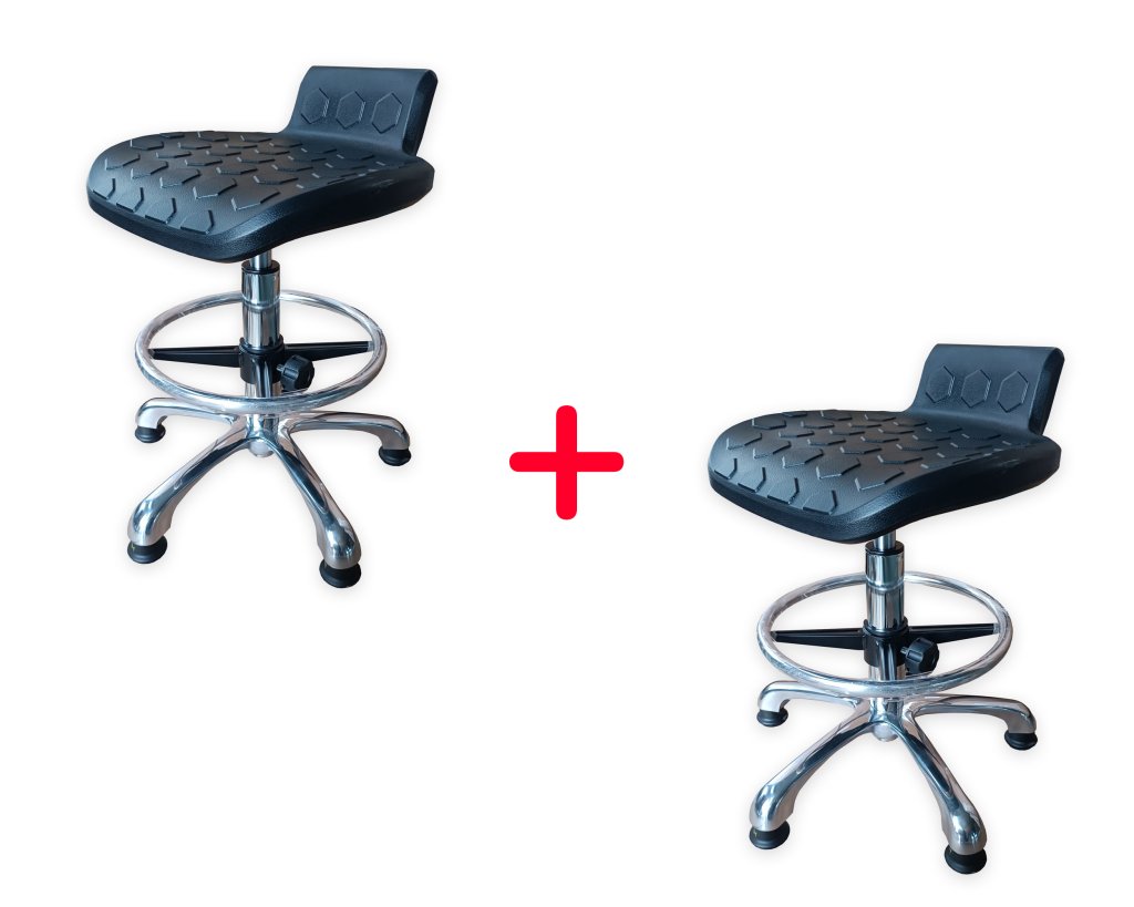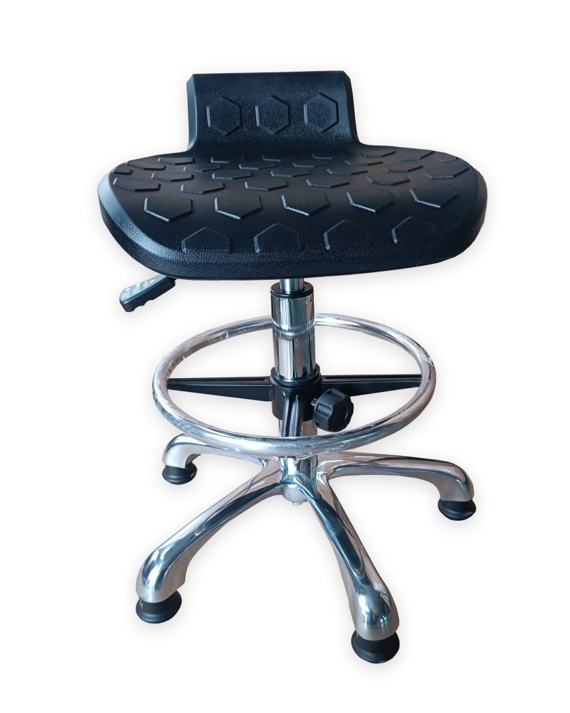Pracovná stolička so sedákom z PUR peny spĺňajúcej normy pre antistatické prostredie s robustným krížom z hliníka a nosnosťou 130 kg.