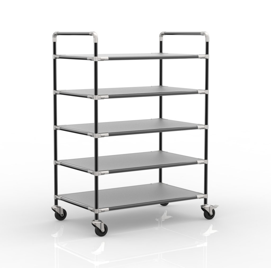 ​​​​​​Antistatický policový vozík z rúrkového stavebnicového systému je ideálnou voľbou na manipuláciu s tovarom citlivým na celý popis a parametre