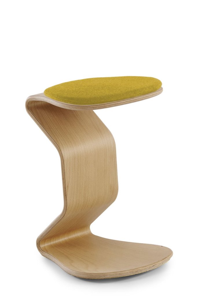 Balančná stolička Ercolino Medium s pevnou výškou 47 cm, vybavená sedákom vyplneným kokosovými vláknami a čalúnením podľa výberu v šiestich rôznych odtieňoch 100% čistej strižnej ovčej vlny. Stolička vyrobená z tvarovanej bukovej preglejky 14 mm s pohľadovými dýhami.