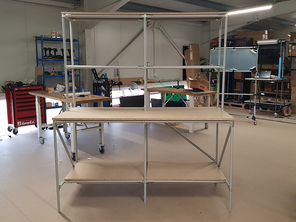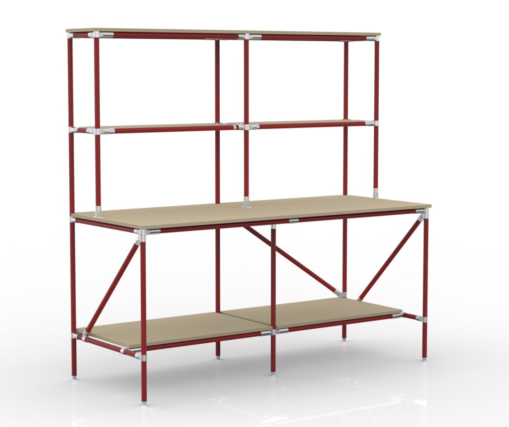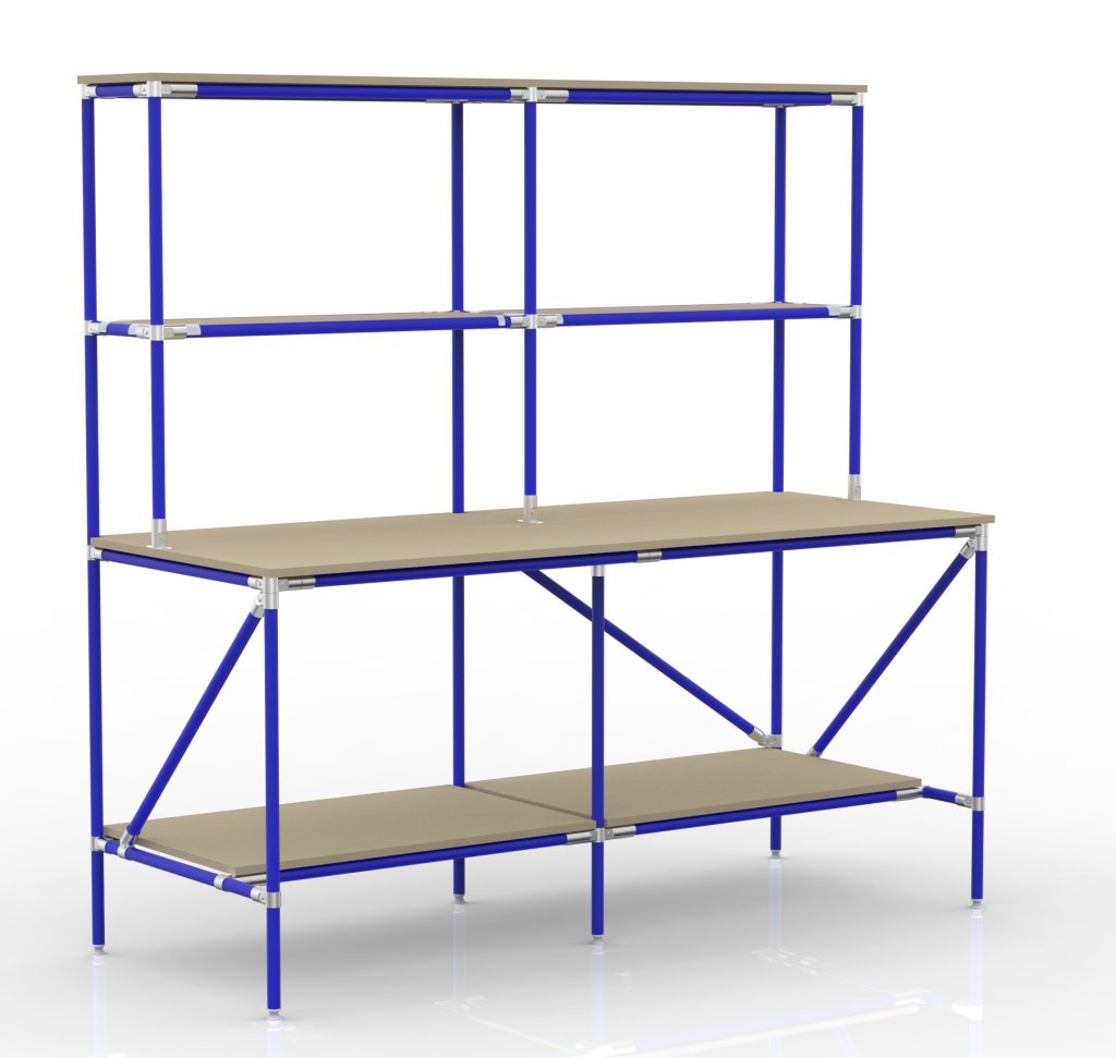 Ekonomický a flexibilný baliaci stôl s odkladacím priestorom z trubkového stavebnicového systému. Pracovná doska a polica sú vyrobené z drevotriesky s hrúbkou 18 mm. Rozmery konštrukcie 1970 x 2000 x 800 mm. Celková nosnosť dosahuje 350 kg, s nosnosťou jednotlivého poschodia až 100 kg.
