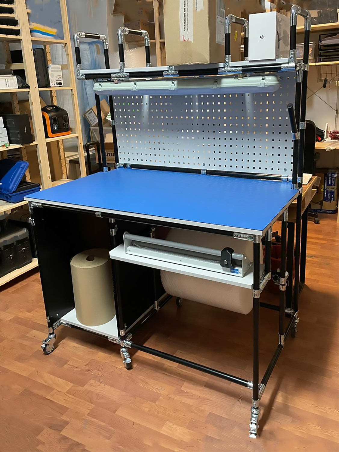 Univerzálny baliaci stôl s úložným priestorom na baliaci materiál na kompletizáciu a expedíciu zásielok. Zvyšuje efektivitu baliaceho procesu a prispieva k poriadku na pracovisku. Konštrukcia z rúrkového systému s možnosťou úpravy na mieru.