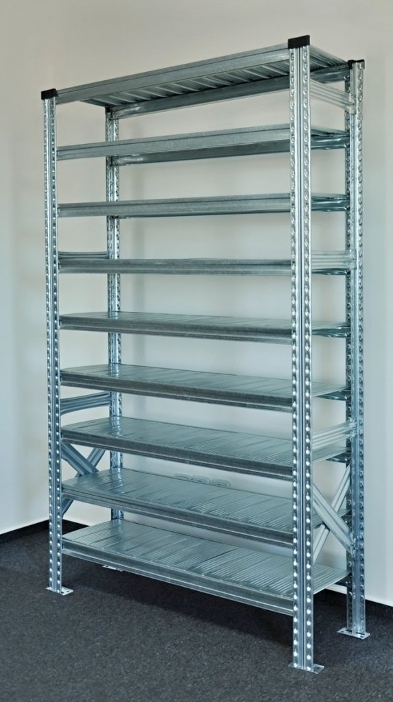 Bezskrutkový policový regál. 9x police, nosnosť 125 kg. Rozmery v. 1972 x š. 1124 x h. 410 mm. celý popis a parametre