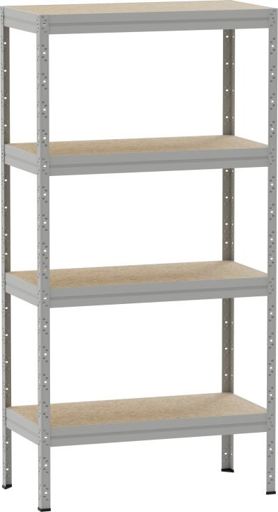 Bezskrutkový regál určen k širokému použitiu. Vyroben z kvalitného oceľového plechu, povrchovo upravené práškovou farbou RAL 7035 - svetlo šedá. 4x polica zo surovej drevotriesky o sile 8 mm, prestaviteľné po 100 mm, nosnosť police 60 kg. Rozmery regálu (v x š x hl.) 1800 x 800 x 400 mm. Dodávaný demontovaný.
