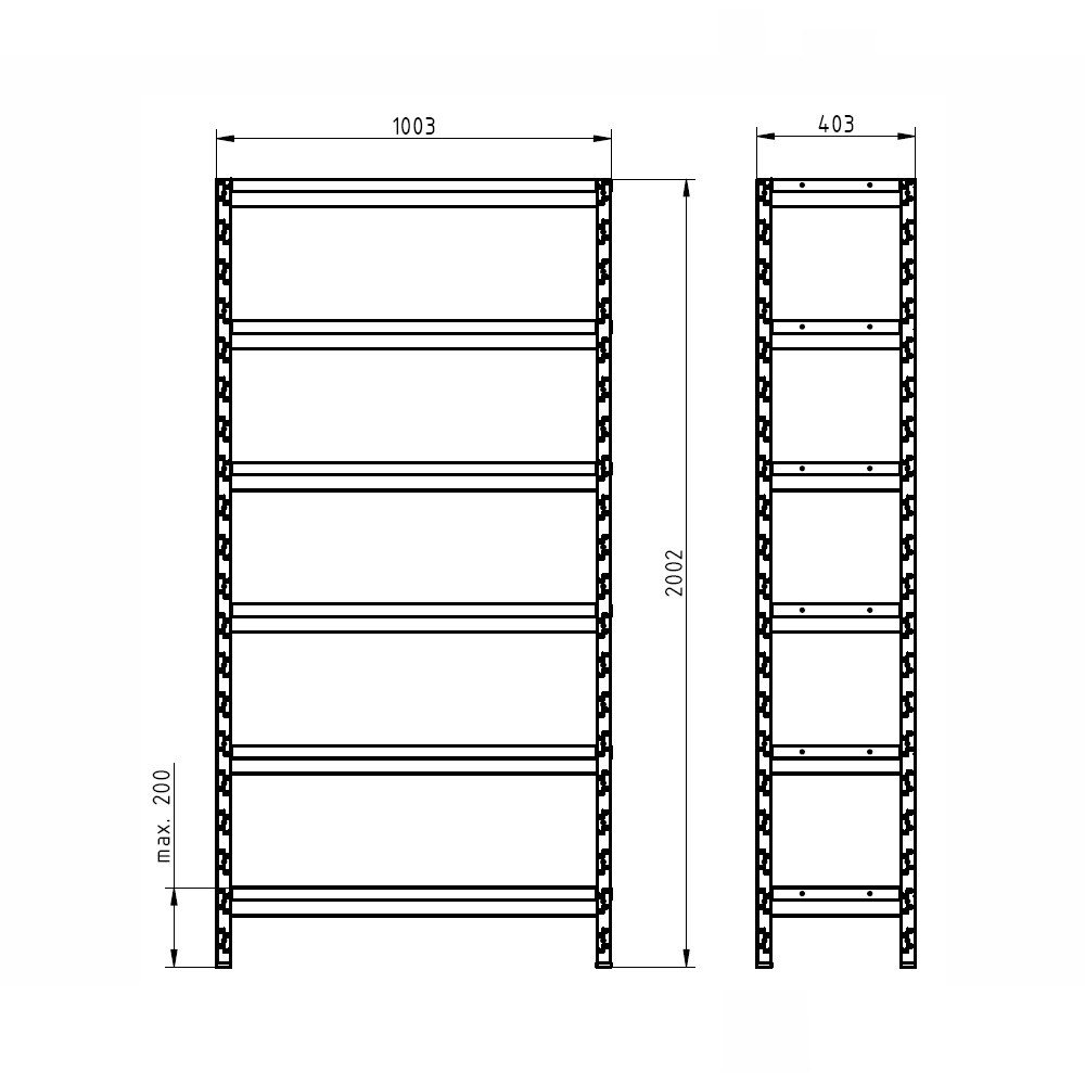 Kovový bezskrutkový regál určený k širokému použitiu. Nosnosť police stanovená na maximálne rovnomerné zaťaženie 175 kg a slúži na ukladanie stredne ťažkých predmetov. Hĺbka regálu 400 mm, šírka 1000 mm, výška 2000 mm, 6 políc.