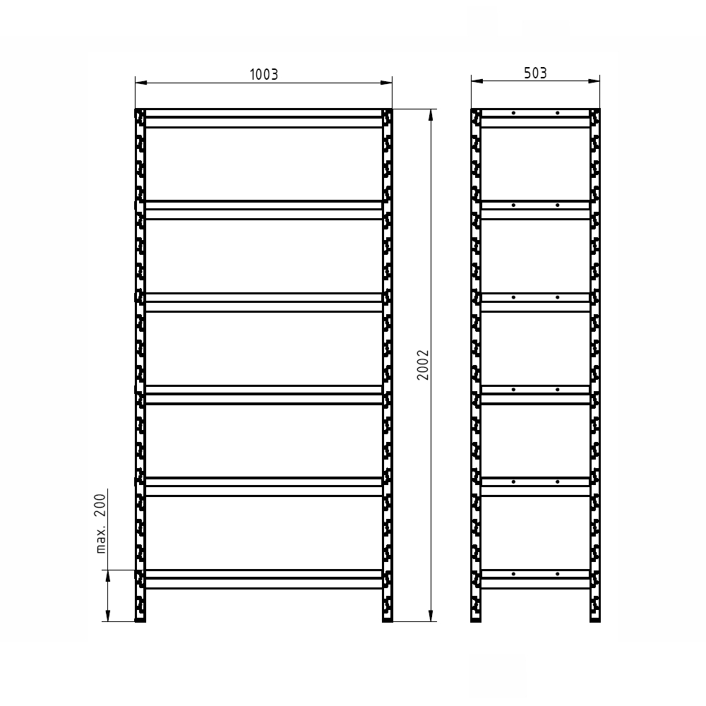 Kovový bezskrutkový regál určený k širokému použitiu. Nosnosť police stanovená na maximálne rovnomerné zaťaženie 175 kg a slúži na ukladanie stredne ťažkých predmetov. Hĺbka regálu 500 mm, šírka 1000 mm, výška 2000 mm, 6 políc.