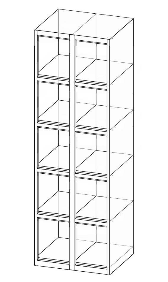 Skriňa s uzamykateľnými boxmi, výška 1850 x šírka 300 x hĺbka 500 mm, cylindrický zámok s jednoduchou závorou alebo uzáver pre visací zámok. Vetracie otvory v dvierkach, svetlosť boxu na výšku 540 mm, priechodzi šírka šatňovej buňky 250 mm.