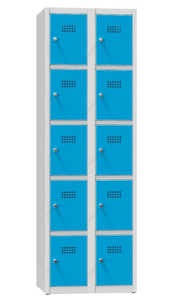 Skriňa kovová s desiatimi uzamykateľnými schránkami šírka 600, výška 1850, hĺbka 500 mm. Šírka každého oddělenia 300 mm, možnosť náhrady zámku uzáverom pre visací zámok alebo mincovným zámkom. Farba korpusu RAL 7035 svetlosivá.