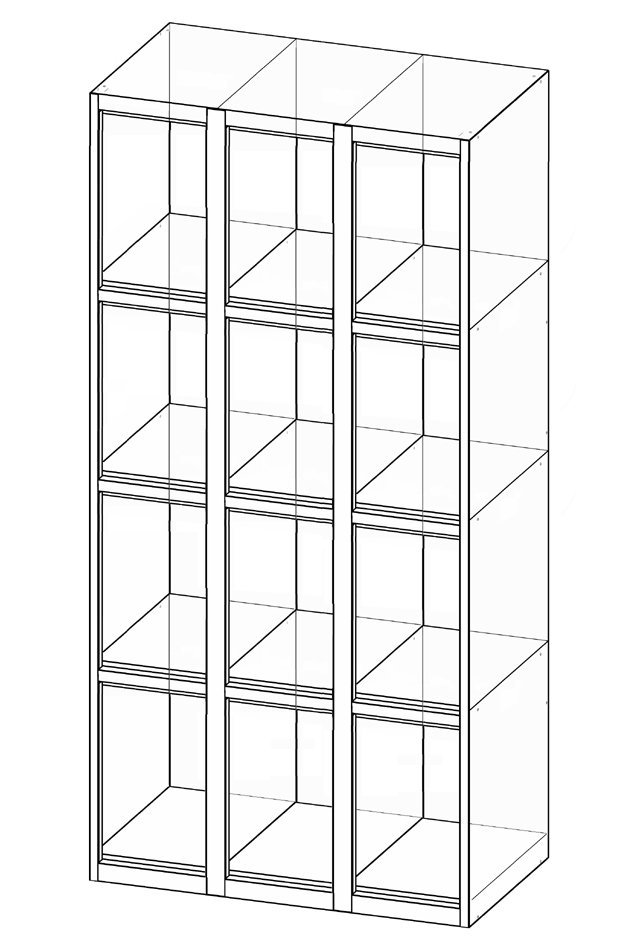 Skriňa s uzamykateľnými boxmi, výška 1850 x šírka 300 x hĺbka 500 mm, cylindrický zámok s jednoduchou závorou alebo uzáver pre visací zámok. Vetracie otvory v dvierkach, svetlosť boxu na výšku 540 mm, priechodzi šírka šatňovej buňky 250 mm.