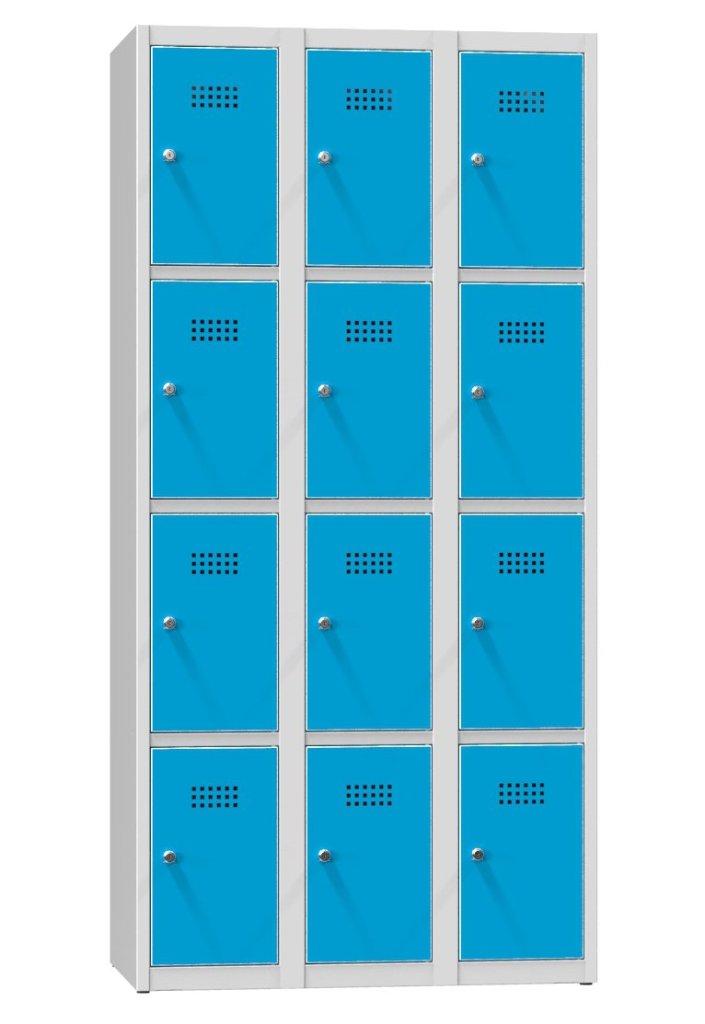 Skriňa kovová s dvanástimi uzamykateľnými schránkami šírka 900, výška 1850, hĺbka 500 mm. Šírka každého oddělenia 300 mm, možnosť náhrady zámku uzáverom pre visací zámok alebo mincovným zámkom. Farba korpusu RAL 7035 svetlosivá.