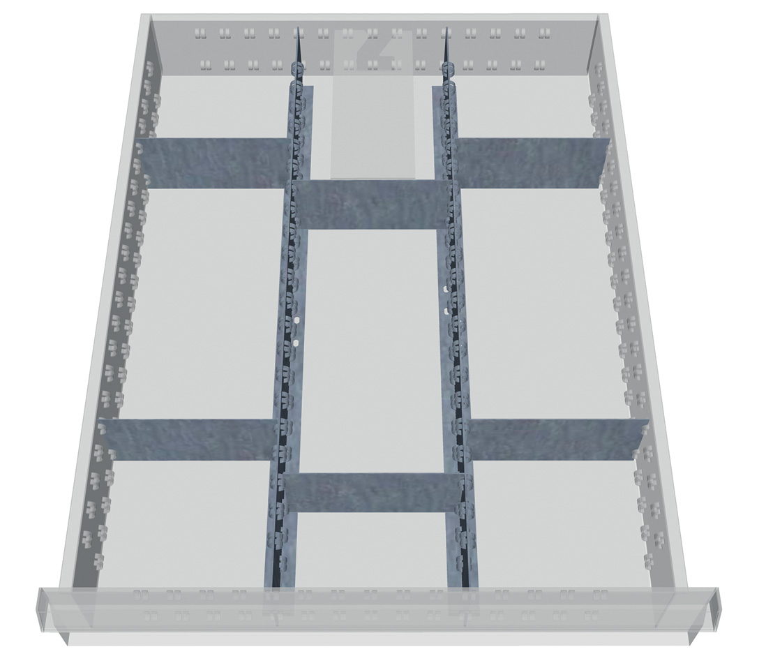 Plastová deliaca vložka do zásuviek výšky 100 mm. Vhodné iba do zásuvkových skríň firmy Bedrunka+Hirth šírky 555 a hĺbky 736 mm.