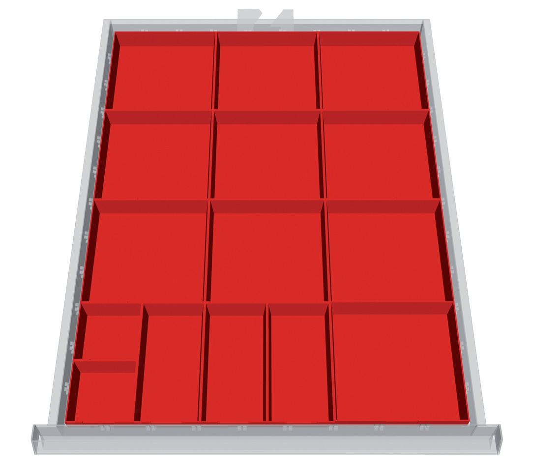 Delenie do zásuviek - set pre 4 zásuvky. Obsahuje 1x gumovou vložku pre zásuvky výšky 50 - 200 mm, 1x plastové delenie pre zásuvky výšky 100 mm, 1x kovové delenie pre zásuvky výšky 100 mm a 1x kovové delenie pre zásuvky výšky 150 mm. Vhodné iba do zásuvkových skríň firmy Bedrunka + Hirth šírky 555 a hĺbky 736 mm.