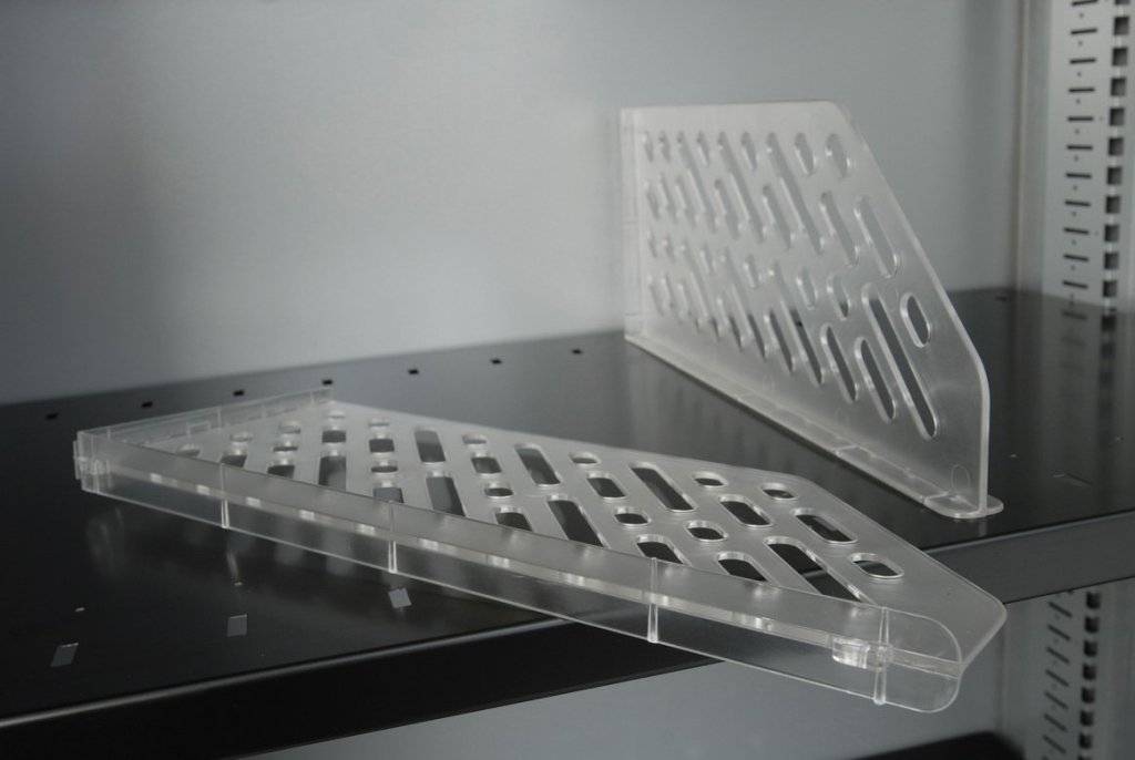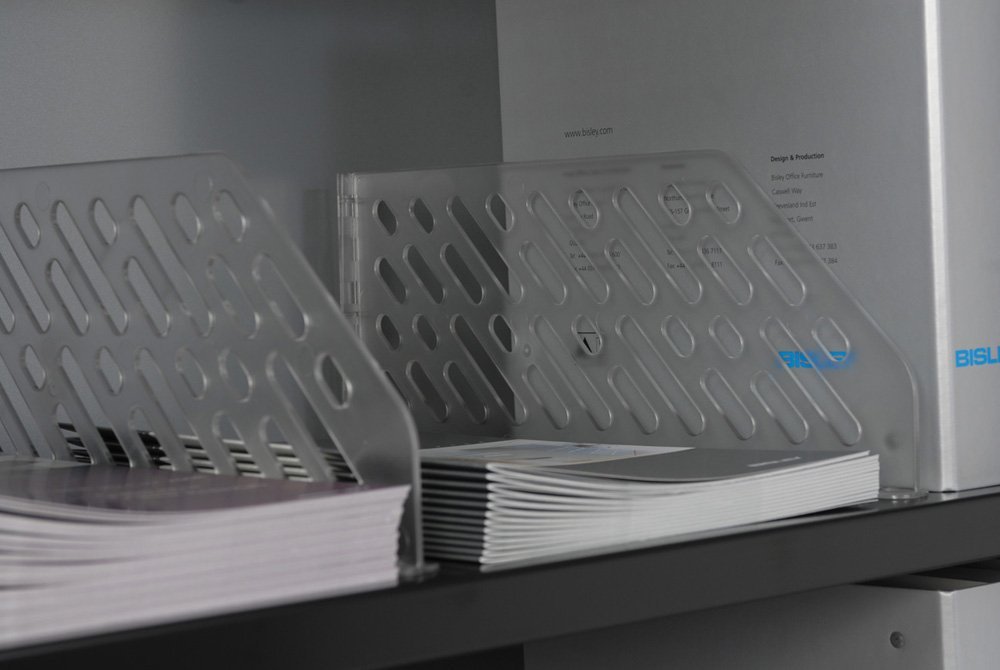 Rozdelníky pre policu BSS (sada 5 ks). Vyrobené z transparentného plastu. Výška 152/50 mm x šírka 23 mm x hĺbka 385 mm. Upevňujú sa do otvorov v polici typ BSS. Samotná police BSS je vhodná iba do roletových skríň Bisley Essentials typ YETB10XX (šírka 1000 mm), dvojdverových skríň Bisley Essentials typ YECB09XX (šírka 914 mm) a demontovaných dvojdverových skríň typ KC.