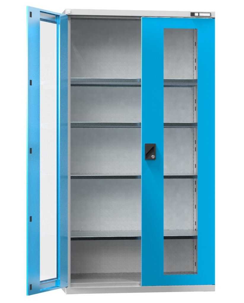 Skriňa s krídlovými dverami, 4x polica staviteľná po 25mm (pozink), sklenené dvere v oceľovom ráme, nosnosť 600 kg. Výška 1950 x celý popis a parametre
