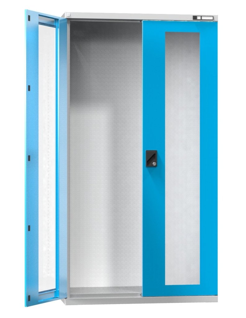 Skriňa s krídlovými dverami, sklenené dvere v oceľovom ráme, nosnosť 600 kg. Výška 1950 x šírka 1044 x hĺbka 405 mm. celý popis a parametre