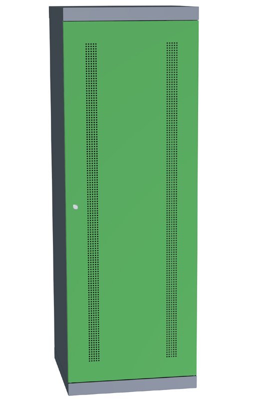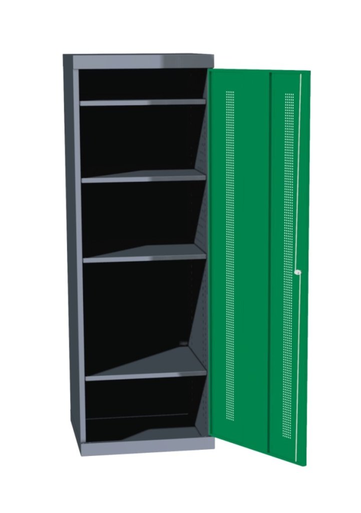 Dielenská skriňa Economy jednodverová. Výška 1800 x šírka 620 x hĺbka 600 mm, 4 prestaviteľné police. Farba korpusu sivá RAL 7031, farba dverí zelená RAL 6001, modrá RAL 5012, červená RAL 3000 alebo žltá RAL 1023..