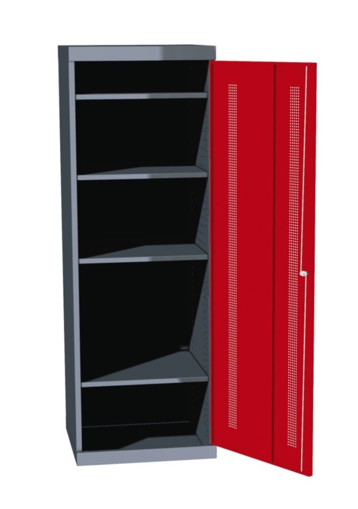 Dielenská skriňa Economy jednodverová. Výška 1800 x šírka 620 x hĺbka 600 mm, 4 prestaviteľné police. Farba korpusu sivá RAL 7031, celý popis a parametre