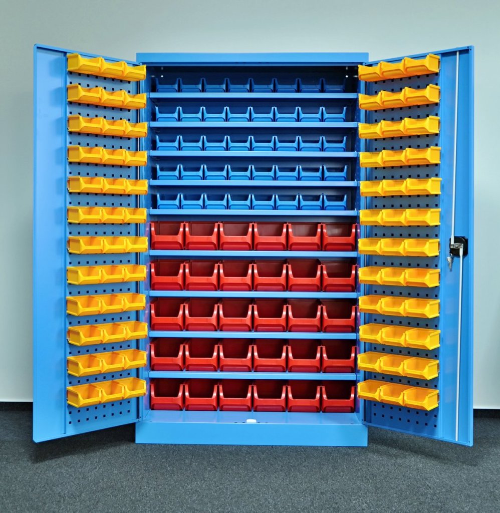 Dielenská skriňa s plastovými boxami. Výška 1600 x šírka 950 x hĺbka 400 mm. Viace informacií o plastových boxoch v celom popise (pozri ľavé menu).