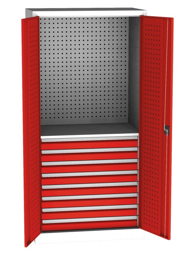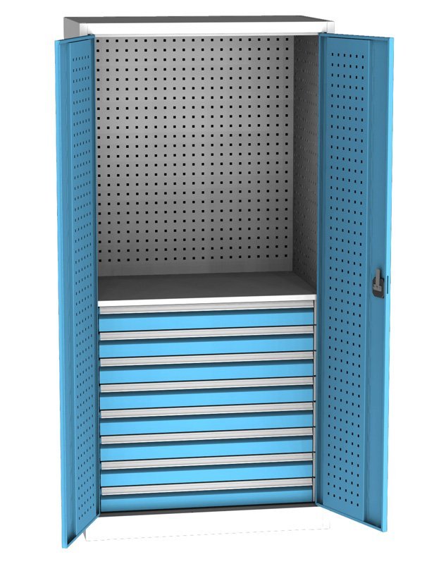Dvojdverová dielenská skriňa, šírka 950, výška 1950, hĺbka 600 mm, 1 polica , 8 zásuviek. Možnosť náhrady plných dverí dverami so sklenenou alebo drôtenou výplňou. Farba korpusu RAL 7035 svetlosivá.