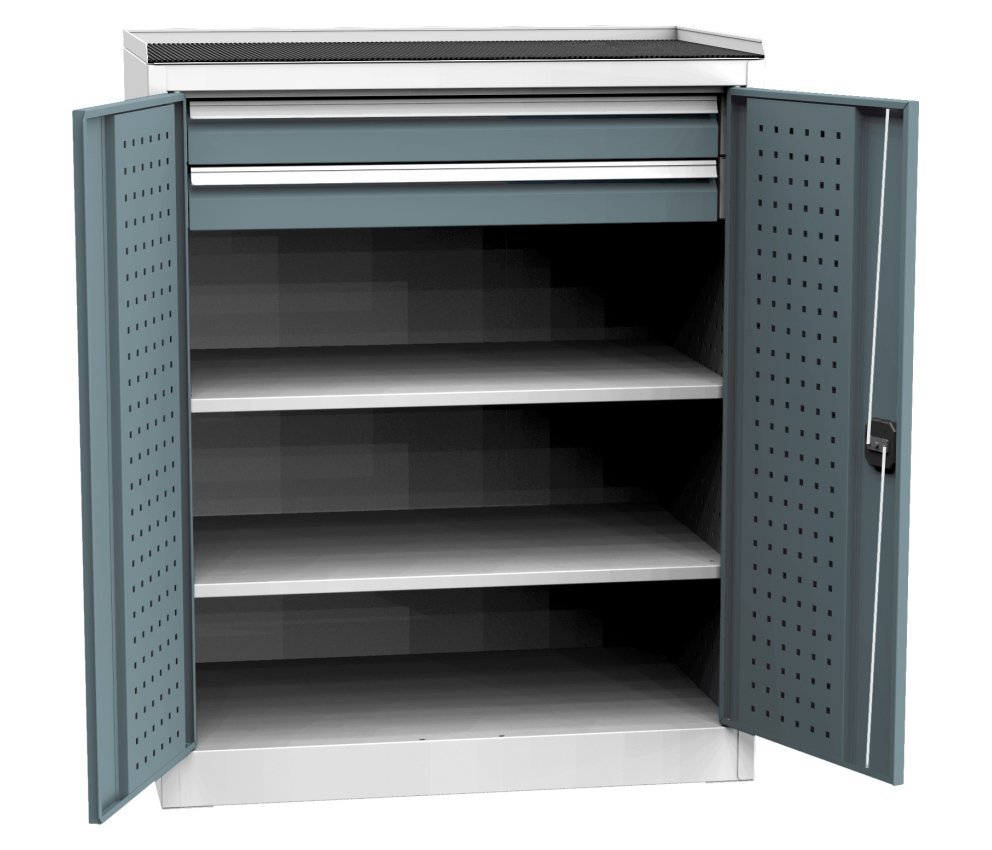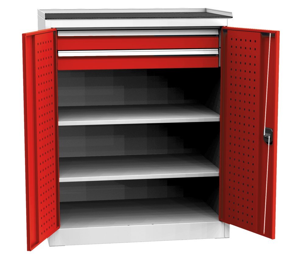Dvojdverová dielenská skriňa, šírka 950, výška 1180, hĺbka 600 mm, 2 police, 2 zásuvky. Možnosť náhrady plných dverí rámom s tvrdeným sklom alebo drôtenou mrežou pre lepší prehľad o obsahu skrine. Nosnosť korpusu 800 kg, nosnosť zásuvky 50 kg, nosnosť police 100 kg. Farba korpusu RAL 7035 svetlosivá.