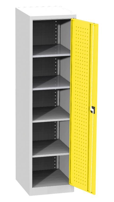Jednodverová dielenská skriňa, šírka 505, výška 1950, hĺbka 600 mm, 4 police. Možnosť náhrady plných dverí rámom s tvrdeným sklom alebo drôtenou mrežou pre lepší prehľad o obsahu skrine. Nosnosť korpusu 800 kg, nosnosť police 100 kg. Farba korpusu RAL 7035 svetlosivá.