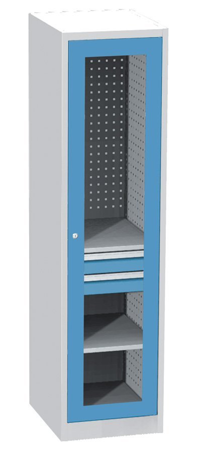 Jednodverová dielenská skriňa so sklenenými dverami v oceľovom ráme, šírka 505, výška 1950, hĺbka 600 mm, 2 police, 2 zásuvky. Nosnosť korpusu 800 kg, nosnosť police 100 kg, nosnosť zásuvky 50 kg. Farba korpusu RAL 7035 svetlosivá.
