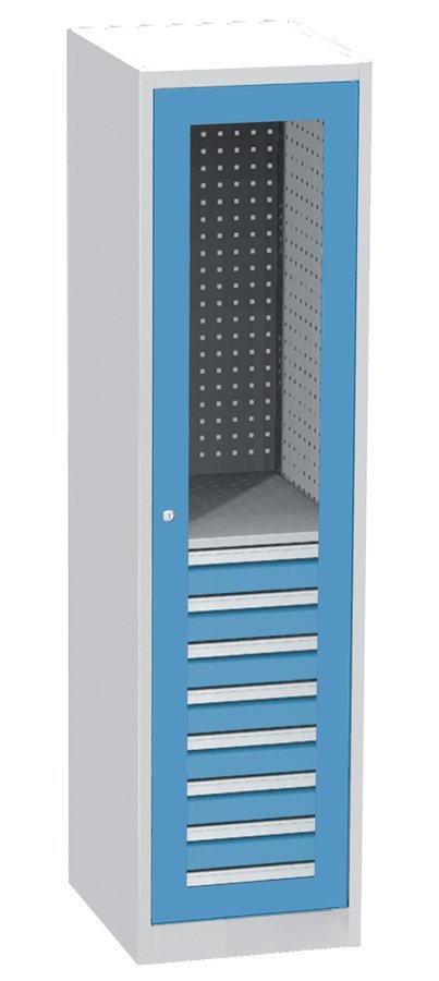 Jednodverová dielenská skriňa so sklenenými dverami v oceľovom ráme, šírka 505, výška 1950, hĺbka 600 mm, 1 polica, 8 zásuviek. Nosnosť korpusu 800 kg, nosnosť police 100 kg, nosnosť zásuvky 50 kg. Farba korpusu RAL 7035 svetlosivá.