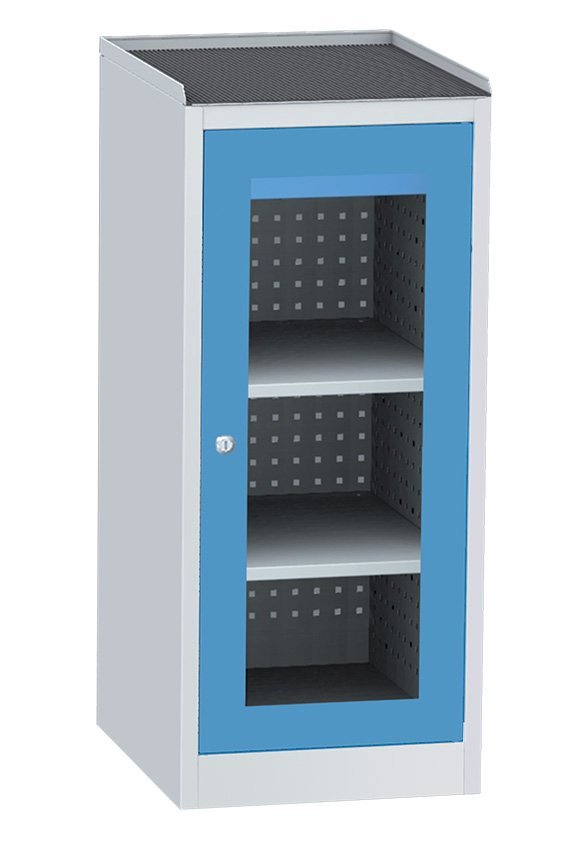 Dvojdverová dielenská skriňa so sklenenými dverami v oceľovom ráme, šírka 505, výška 1180, hĺbka 600 mm, 2 police, 1 zásuvka. Nosnosť korpusu 800 kg, nosnosť zásuvky 50 kg, nosnosť police 100 kg. Farba korpusu RAL 7035 svetlosivá.