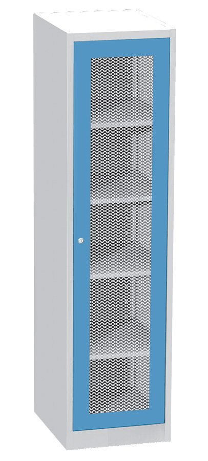 Jednodverová dielenská skriňa s drôtenými dverami v oceľovom ráme, šírka 505, výška 1950, hĺbka 600 mm, 4 police. Nosnosť korpusu 800 kg, nosnosť police 100 kg. Farba korpusu RAL 7035 svetlosivá.