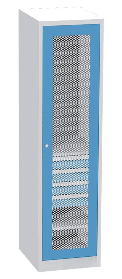 Jednodverová dielenská skriňa s drôtenými dverami v oceľovom ráme, šírka 505, výška 1950, hĺbka 600 mm, 2 police, 4 zásuvky. Nosnosť korpusu 800 kg, nosnosť police 100 kg, nosnosť zásuvky 50 kg. Farba korpusu RAL 7035 svetlosivá.