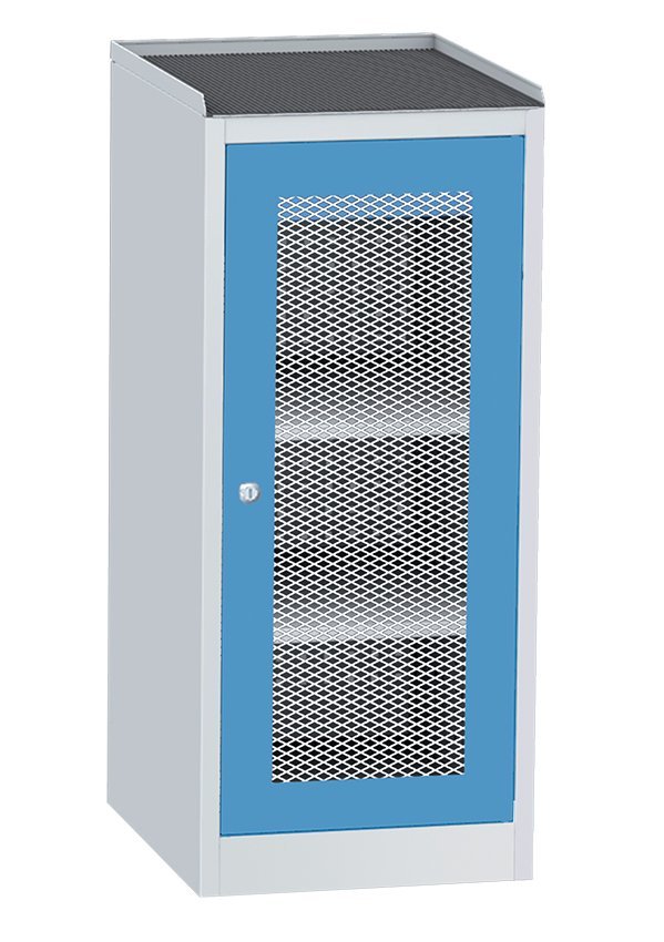 Dvojdverová dielenská skriňa s drôtenými dverami v oceľovom ráme, šírka 505, výška 1180, hĺbka 600 mm, 2 police, 1 zásuvka. Nosnosť korpusu 800 kg, nosnosť zásuvky 50 kg, nosnosť police 100 kg. Farba korpusu RAL 7035 svetlosivá.