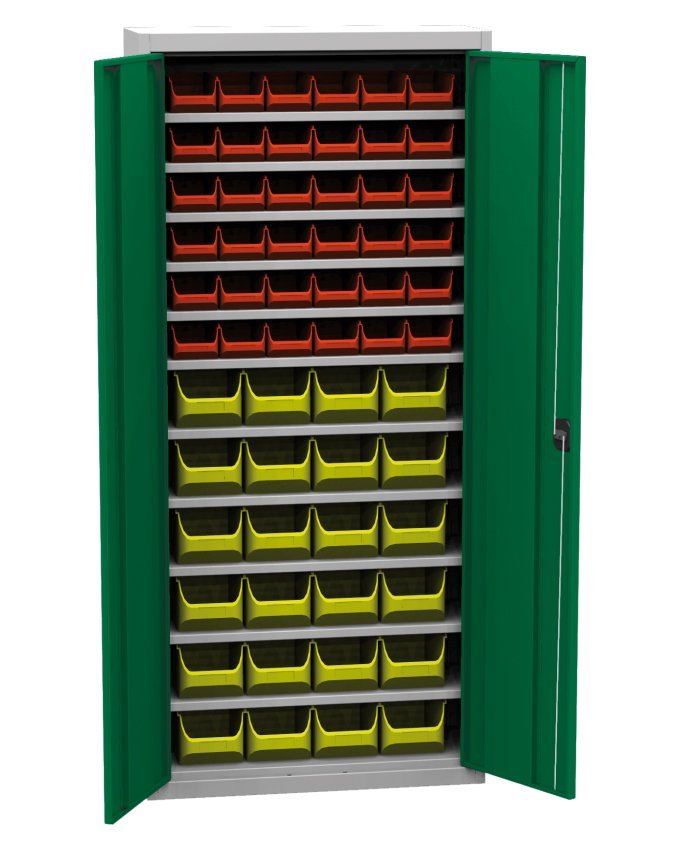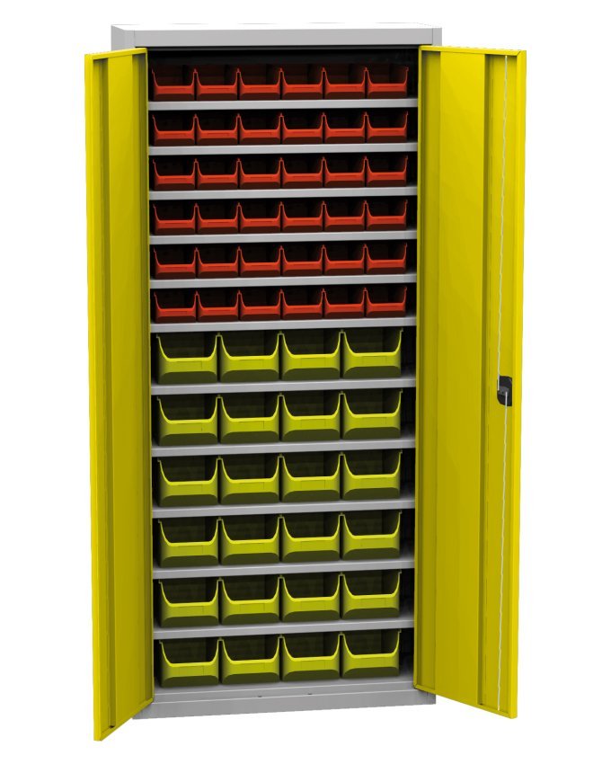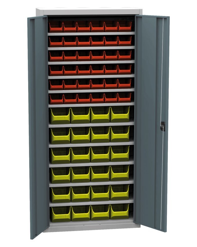 Dvojdverová dielenská skriňa s plastovými boxmi (60), šírka 750, výška 1650, hĺbka 300 mm. 11x polica, 36x plastový box 456231 (š.102 x v.75 x hĺ.215 mm), 24x plastový box 456210 (š.150 x v.125 x hĺ.235 mm). Možnosť náhrady plných dverí dverami so sklenenou alebo drôtenou výplňou.