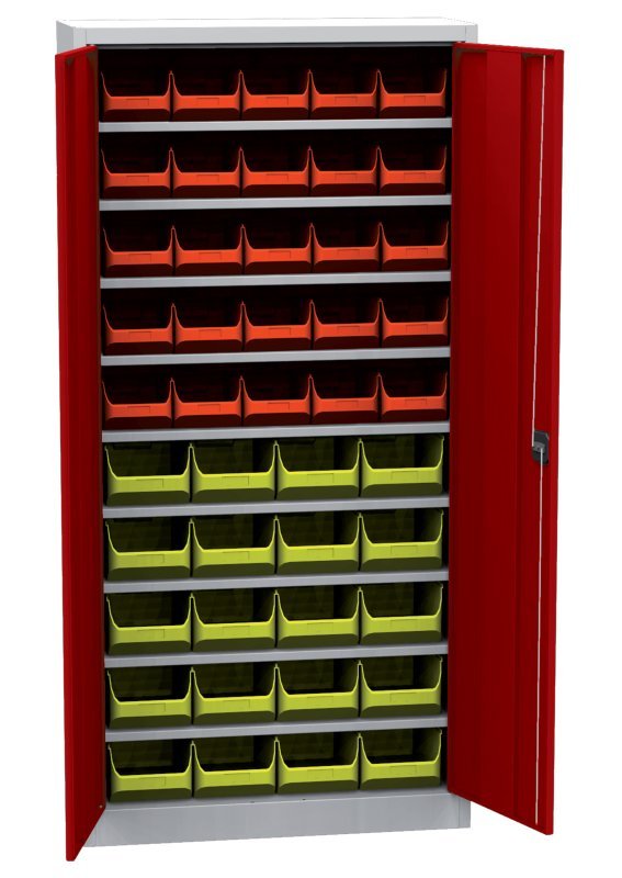 Dvojdverová dielenská skriňa s plastovými boxmi (40), šírka 950, výška 1950, hĺbka 400 mm. 9x police, 20x plastový box 456213 (š.205 x v.150 x hĺ.355 mm) a 20x plastový box 456214 (š.205 x v.150 x hĺ.355 mm). Možnosť náhrady plných dverí dverami so sklenenou alebo drôtenou výplňou.