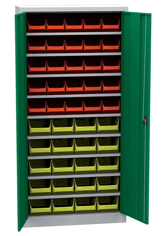 Dvojdverová dielenská skriňa s plastovými boxmi (60), šírka 750, výška 1650, hĺbka 300 mm. 11x polica, 36x plastový box 456231 (š.102 x v.75 x hĺ.215 mm), 24x plastový box 456210 (š.150 x v.125 x hĺ.235 mm). Možnosť náhrady plných dverí dverami so sklenenou alebo drôtenou výplňou.