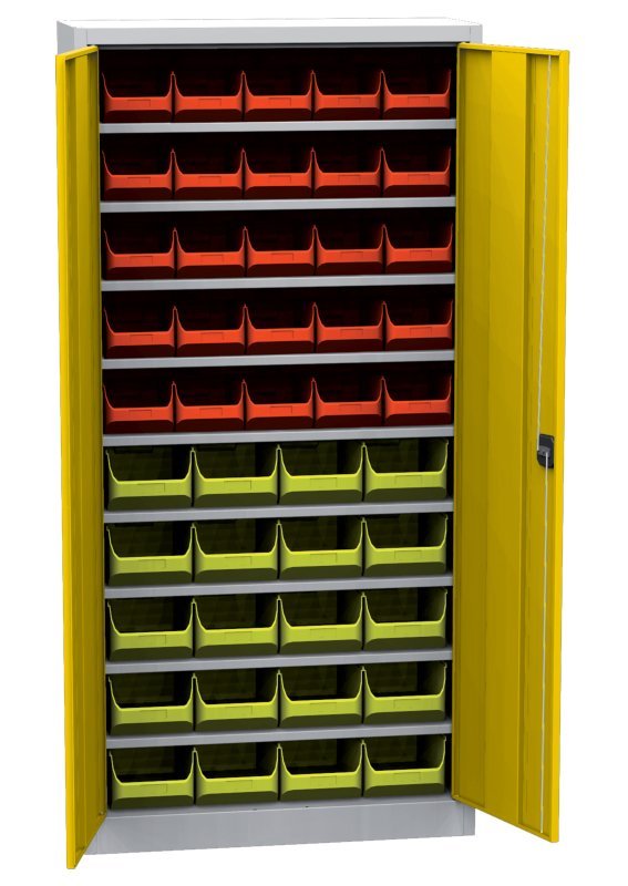 Dvojdverová dielenská skriňa s plastovými boxmi (40), šírka 950, výška 1950, hĺbka 400 mm. 9x police, 20x plastový box 456213 (š.205 x v.150 x hĺ.355 mm) a 20x plastový box 456214 (š.205 x v.150 x hĺ.355 mm). Možnosť náhrady plných dverí dverami so sklenenou alebo drôtenou výplňou.