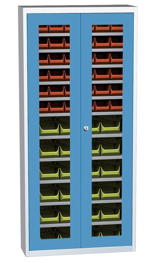 Dvojdverová dielenská skriňa s plastovými boxmi (60), šírka 750, výška 1650, hĺbka 300 mm. 11x polica, 36x plastový box 456205 (š.75x v.102 x hĺ.160 mm), 24x plastový box 456242 (š.82 x v.137 x hĺ.160 mm). Sklenené dvere v oceľovom ráme. Farba korpusu RAL 7035 svetlosivá.