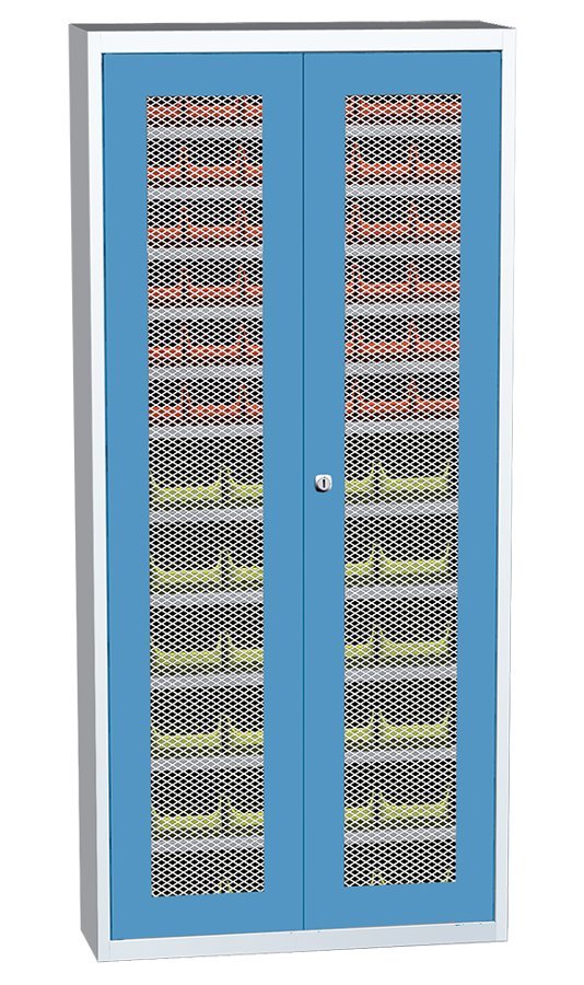 Dvojdverová dielenská skriňa s plastovými boxmi (60), šírka 750, výška 1650, hĺbka 300 mm. 11x polica, 36x plastový box 456231 (š.102 x v.75 x hĺ.215 mm), 24x plastový box 456210 (š.150 x v.125 x hĺ.235 mm). Možnosť náhrady plných dverí dverami so sklenenou alebo drôtenou výplňou.
