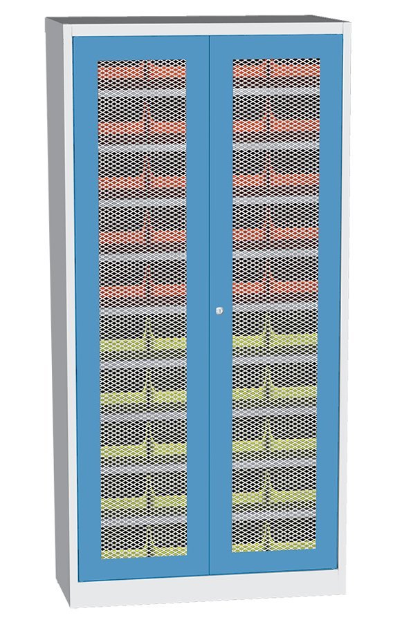 Dvojdverová dielenská skriňa s plastovými boxmi (32), šírka 750, výška 800, hĺbka 300 mm. 5x polica, 24x plastový box 456201 (š.102 x v.60 x hĺ.100 mm), 8x plastový box 456210 (š.150 x v.125 x hĺ.235 mm). Možnosť náhrady plných dverí dverami so sklenenou alebo drôtenou výplňou.