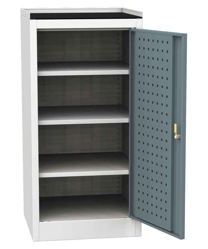Dielenská skrinka na náradie, šírka 500, výška 1030, hĺbka 500 mm. Horná odkladacia plocha s gumovou podložkou a s okrajom proti prepadnutiu drobných predmetov. Farba korpusu RAL 7035 svetlosivá.