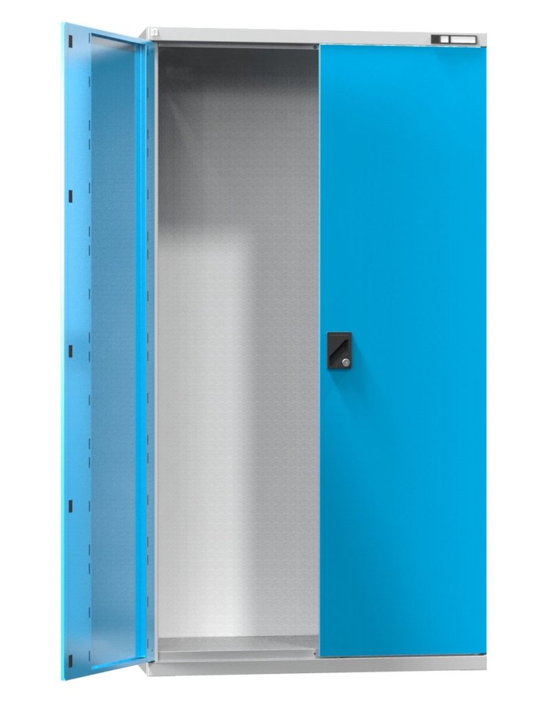 Skriňa s krídlovými dverami, plné dvierka s výztuhami pre perfo, nosnosť 600 kg. Výška 1950 x šírka 1044 x hĺbka 405 mm.