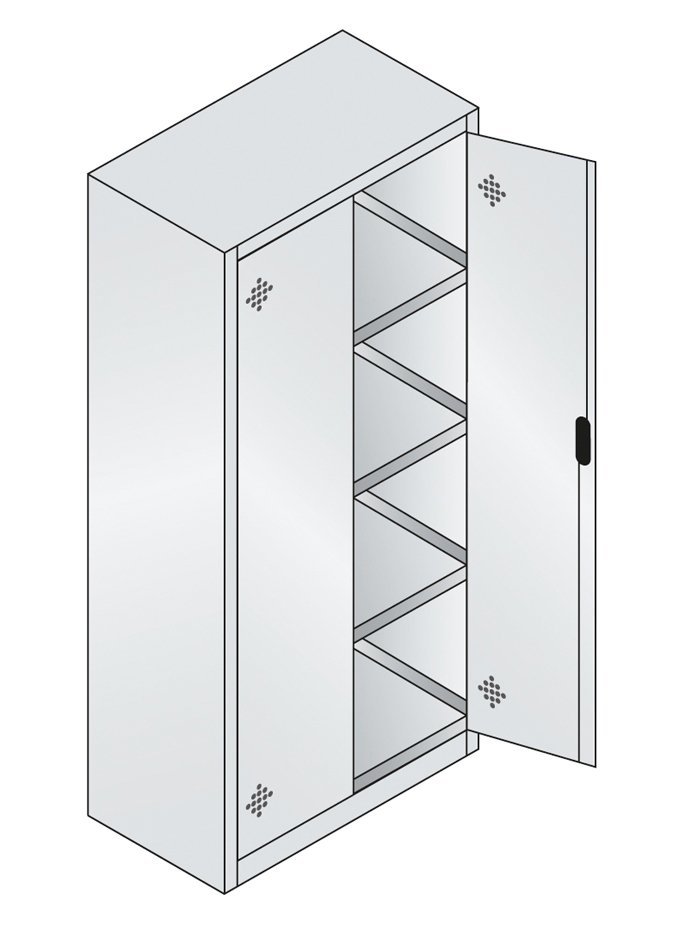 Dvojdverová dielenská skriňa vhodná pre prechovávanie látok, ktoré môžu znečistiť prírodné prostredie. 4x prestaviteľná pozinkovaná vanička, nosnosť 80 kg/vanička. Cylindrický bezpečnostný zámok s rukoväťou. Rozmery v mm (V x Š x H) 1950 x 930 x 500.