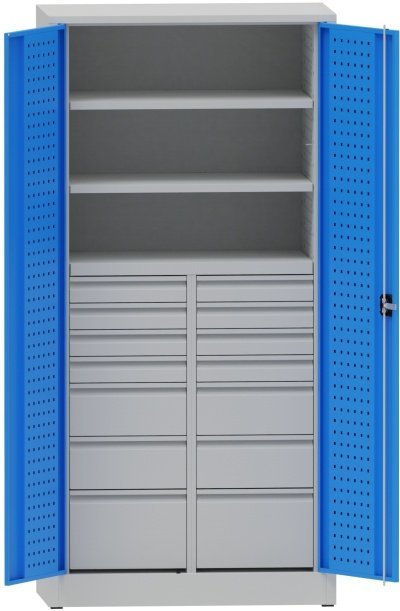 Dvojdverová dielenská skriňa, perforované dvere. Výška 1950 x šírka 950 x hĺbka 500 mm. Trojbodový rozvorový zámok, 14x zásuvka, 2x polica. Farba korpusu RAL 7035 svetlosivá, dverí RAL 7035 svetlo sivá alebo RAL 5012 modrá.