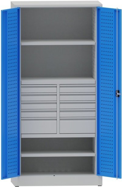 Dvojdverová dielenská skriňa, perforované dvere. Výška 1950 x šírka 950 x hĺbka 500 mm. Trojbodový rozvorový zámok, 10x zásuvka, 2x polica. Farba korpusu RAL 7035 svetlosivá, dverí RAL 7035 svetlo sivá alebo RAL 5012 modrá.