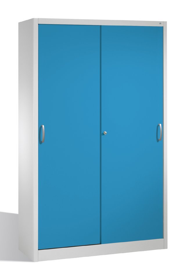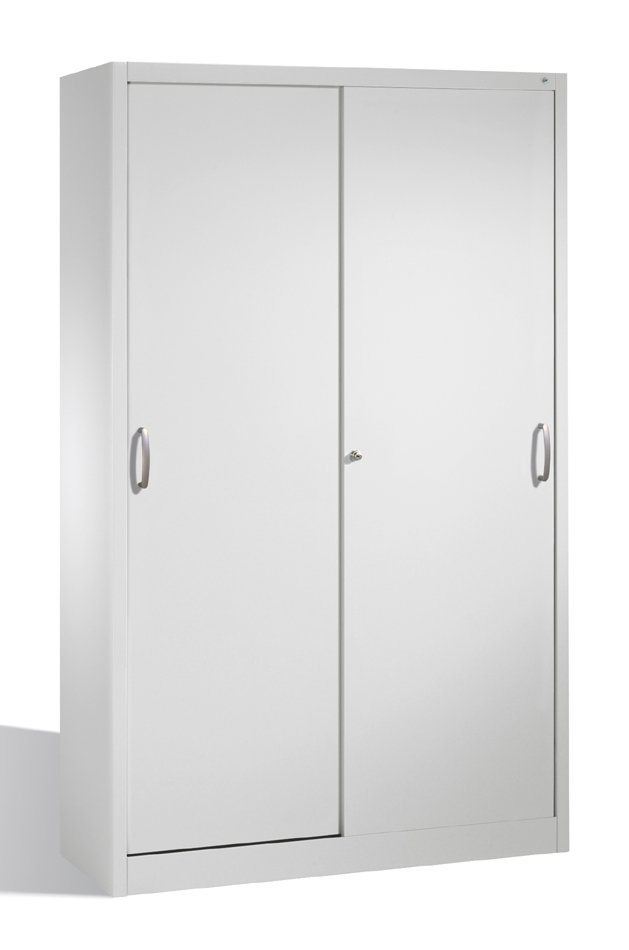 Skriňa s posuvnými dverami, 3x polica staviteľná po 25 mm (pozinok), plná dvierka, nosnosť 600 kg. Výška 1950 x šírka 1044 x hĺbka 405 mm. Plné dvere možno nahradiť posuvnými sklenenými dverami.