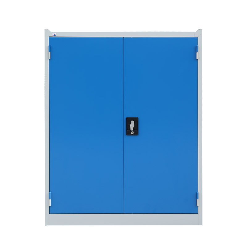 Dvojdverová dielenská skriňa, šírka 950, výška 1950, hĺbka 600 mm, 2 police, 2 zásuvky. Možnosť náhrady plných dverí dverami so sklenenou alebo drôtenou výplňou. Farba korpusu RAL 7035 svetlosivá.