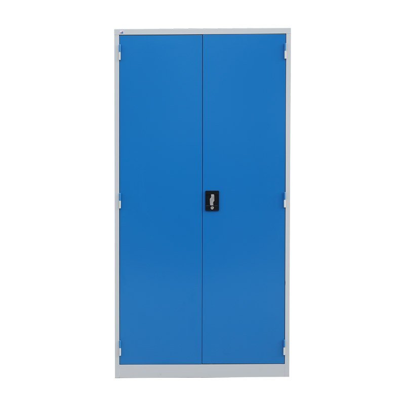 Dvojdverová dielenská skriňa economy s perfopanely. Výška 1950 x šírka 950 x hĺbka 500 mm. Trojbodový rozvorový zámok, 4 nastaviteľné police. Farba korpusu RAL 7035 svetlosivá, dverí RAL 7035 svetlosivá, RAL 5005 modrá a RAL 5012 modrá.
