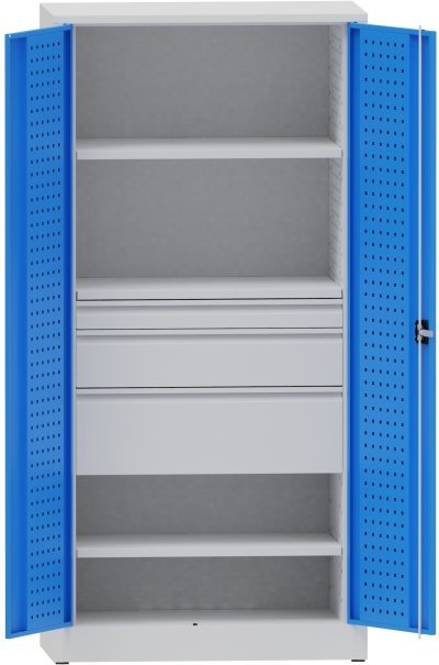 Dvojdverová dielenská skriňa, perforované dvere. Výška 1950 x šírka 950 x hĺbka 500 mm. Trojbodový rozvorový zámok, 3x zásuvka, 2x polica. Farba korpusu RAL 7035 svetlosivá, dverí RAL 7035 svetlo sivá alebo RAL 5012 modrá.
