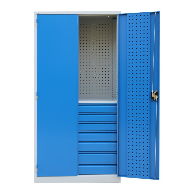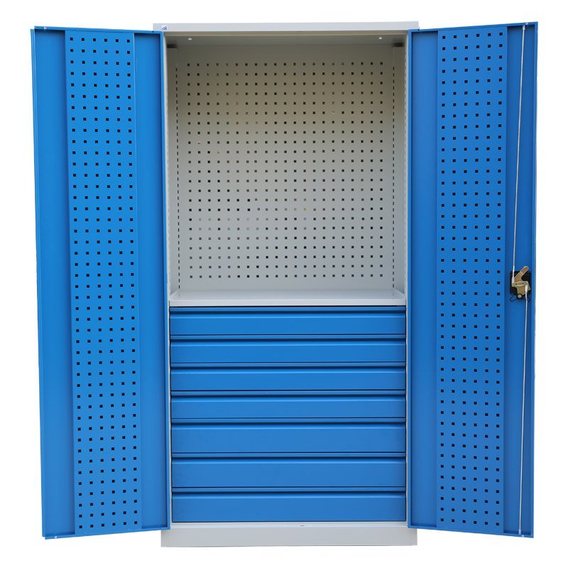 Dvojdverová dielenská skriňa, perforovaný chrbát (horná polovica) a dvere. Výška 1850 x šírka 920 x hĺbka 500 mm. Trojbodový rozvorový zámok, 7x zásuvka. Farba korpusu RAL 7044 svetlosivá, farba dverí RAL 5017 modrá.