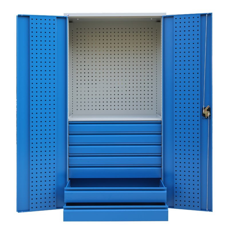 Dvojdverová dielenská skriňa economy s perfopanely. Výška 1950 x šírka 950 x hĺbka 500 mm. Trojbodový rozvorový zámok, 3 nastaviteľné police, 3 zásuvky (90% výsuv). Farba korpusu RAL 7035 svetlosivá, dverí RAL 7035 svetlosivá, RAL 5005 modrá a RAL 5012 modrá.
