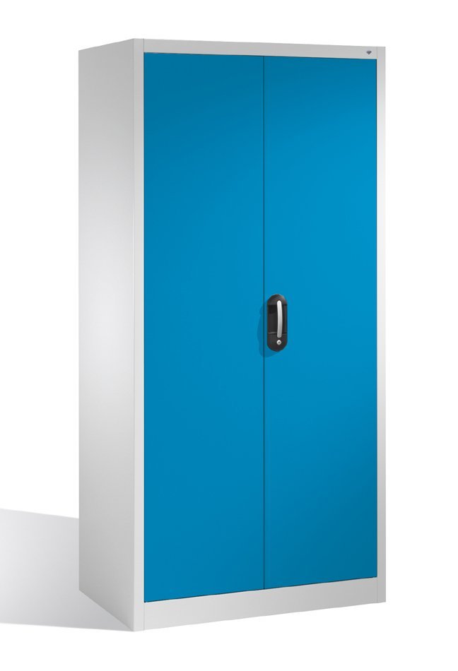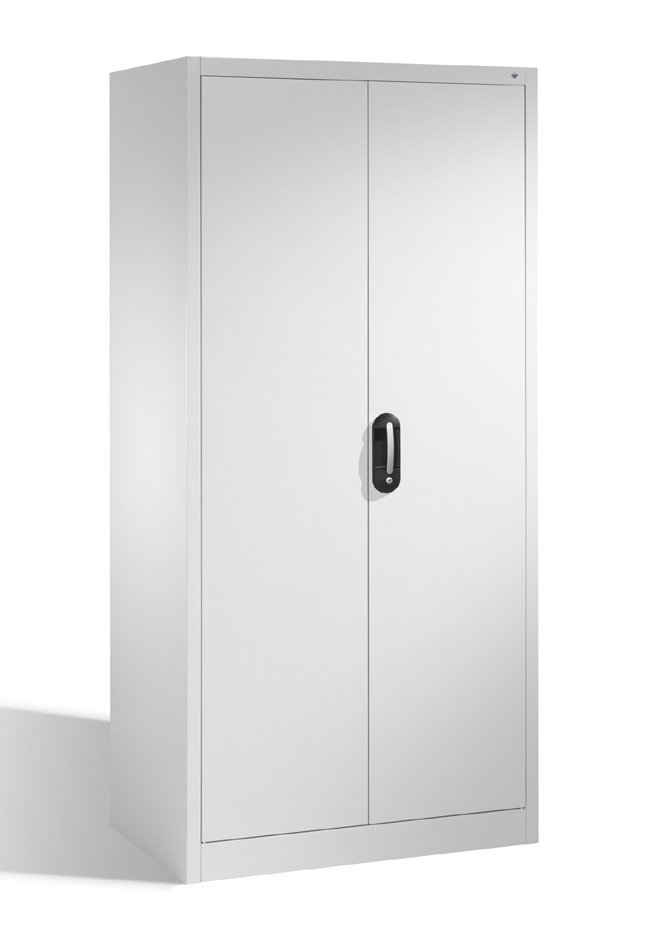 Dvojdverová dielenská skriňa, šírka 950, výška 1950, hĺbka 600 mm, 2 police. Možnosť náhrady plných dverí dverami so sklenenou alebo drôtenou výplňou. Farba korpusu RAL 7035 svetlosivá.