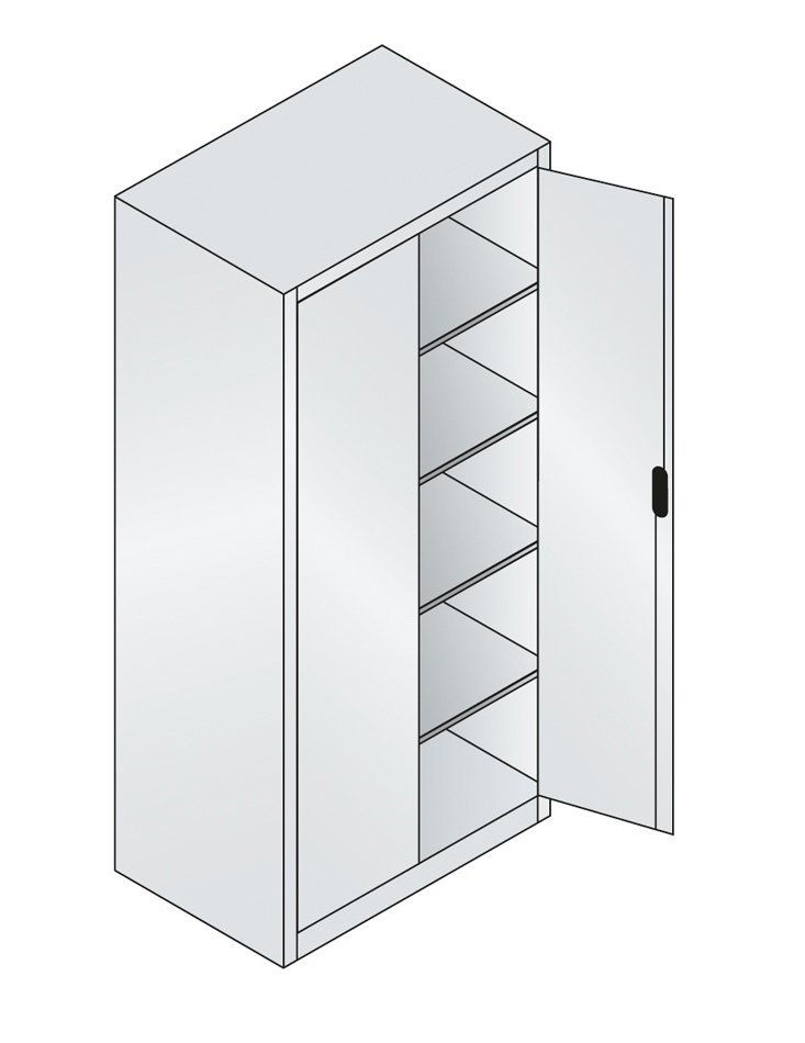 Dvojdverová dielenská skriňa, šírka 950, výška 1950, hĺbka 600 mm, 4 police. Možnosť náhrady plných dverí dverami so sklenenou alebo drôtenou výplňou. Farba korpusu RAL 7035 svetlosivá.